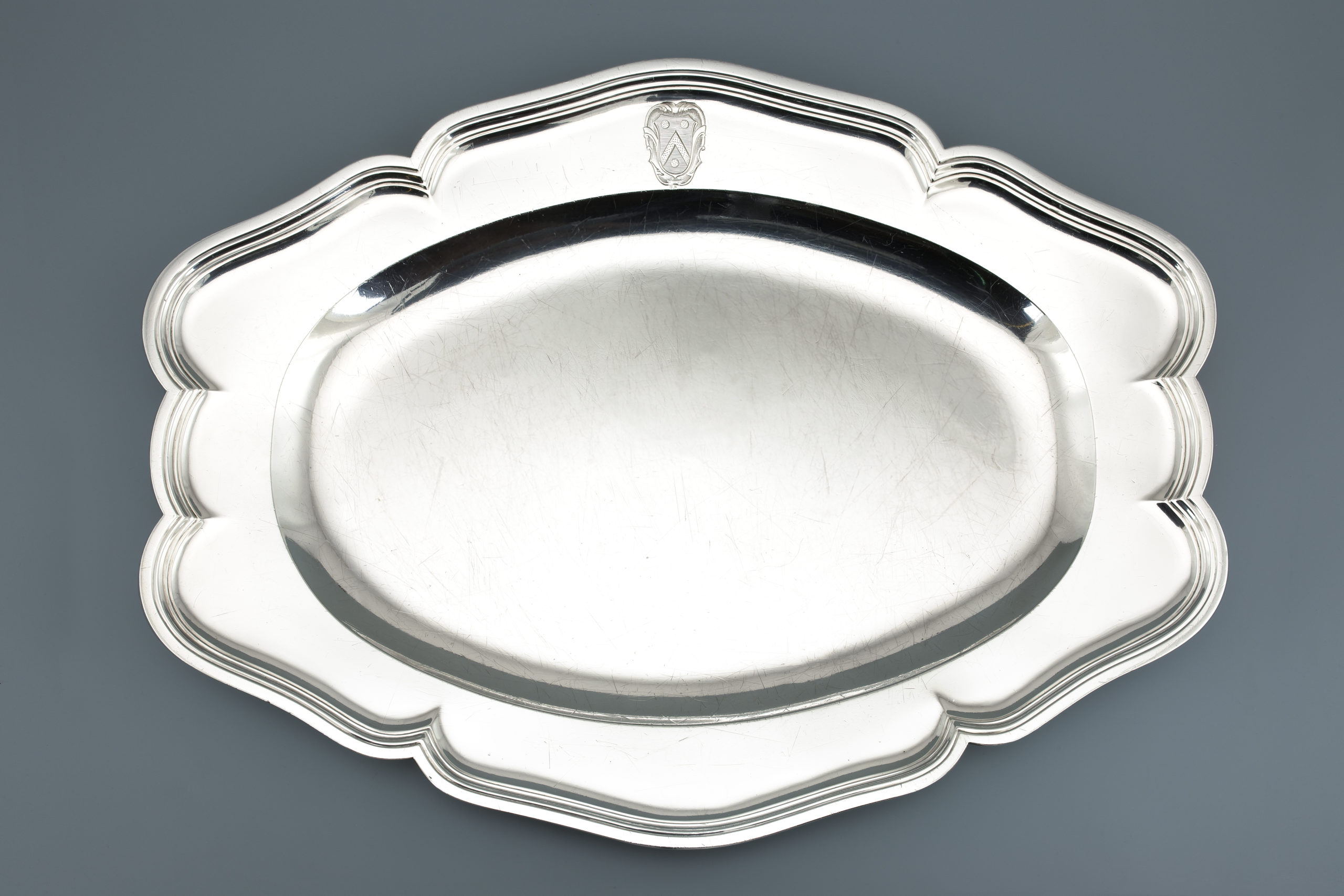 Each shaped oval with molded rim, comprising one large, two medium and a smaller platter. Engraved with the coat of arms of John Hope (1737 – 1784). He was a distinguished merchant, banker and art collector. His art collection was renowned across Europe Since 1762 he was a member of Hope & Co, a Dutch bank that existed for two and a half centuries. The bank was located in Amsterdam until 1795; originally it concentrated on Great Britain. From 1750 it played a major part in the finances of the Dutch East India Company (VOC).