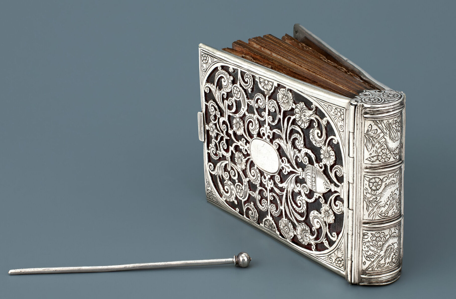 The cover pierced and engraved on both sides with a vase, foliage flowers and C-scrolls, in the centre a blank medallion, the spandrels engraved with flowers, the spine is divided by four ribs into three panels engraved with birds, foliage and flowers, the clasp engraved with further foliage and flowers, the knob is the finial of the inserted silver stylus that was used to write in this small booklet.