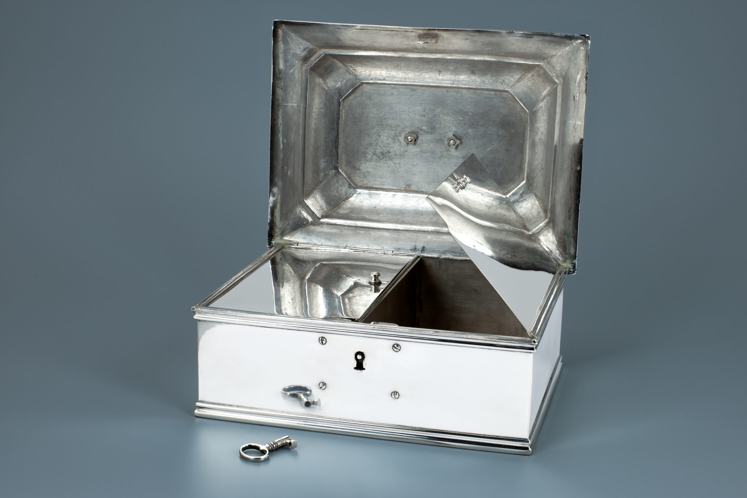 Rectangular, the smooth body with a double rim at the bottom, the lid with a protruding lower edge and stepped upwards, with a domed octagonal top with a hinged handle in the middle on two rosettes with screws on the inside, and a lock on the inside with four mounting screws visible on the outside.