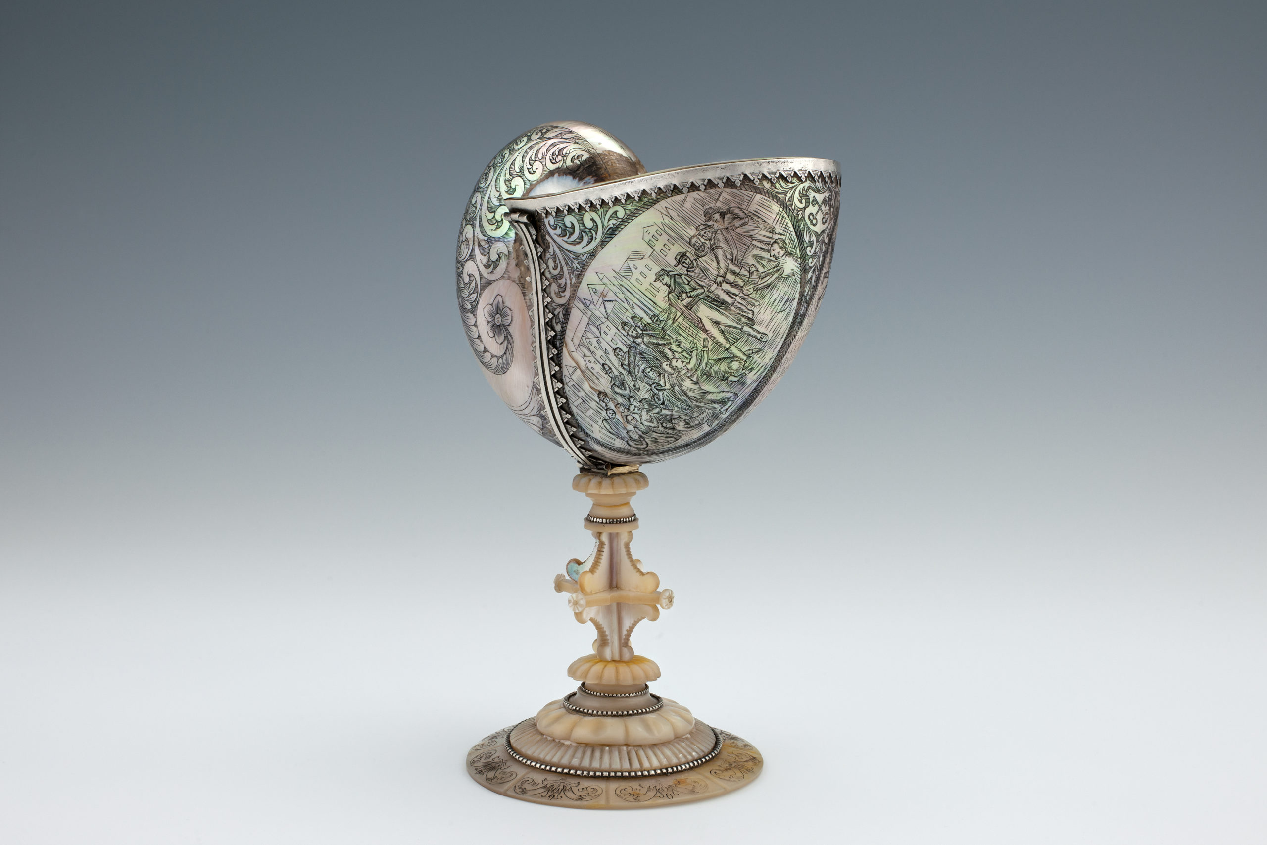 De scenes zijn gevat in ovalen omgeven door een kabelrand, waaromheen krullend gebladerte. De septale kraag is aan weerszijden gegraveerd met krullend acanthus gebladerte eindigend in een anemoon. De schelp is gemonteerd in een gekartelde zilveren montuur om de woonkamer, die vanaf de navel om de schelp naar beneden loopt. De montuur rust op een rijk bewerkte parelmoeren stam die rust op een ronde gesegmenteerde voet, bestaande uit knerrenranden van parelmoer met zilveren parelranden ertussen, de onderste rand is gegraveerd met krullend bladwerk. Aan de voorkant van de schelp is het stadswapen van Leiden gegraveerd, de gekruiste sleutels.
