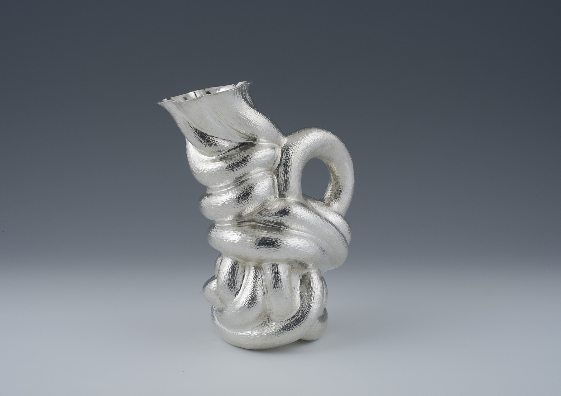 Hephaistos was first designed as a model, using plasticine. When creating such an object it is essential to learn in which direction the object tends to develop, without risking that the artist looses his way during the process, hence resulting in the whole project failing. In order to forge, mould, reshape, chase, heat, and regularly anneal his material to prevent it from tearing, Brouwer had to apply all of his knowledge, experience and skills in the field of silver smithing to the full, and last but not least his intuition as a silversmith. His jug with an integrated hollow handle was chased from one sheet of pure silver, that he selected in view of its good malleability and because the Van Vianen silversmiths also turned out to have worked with a high silver alloy. Using a less pure alloy the moulding of such dynamic and pronounced turning and intertwined bands would not have been possible.