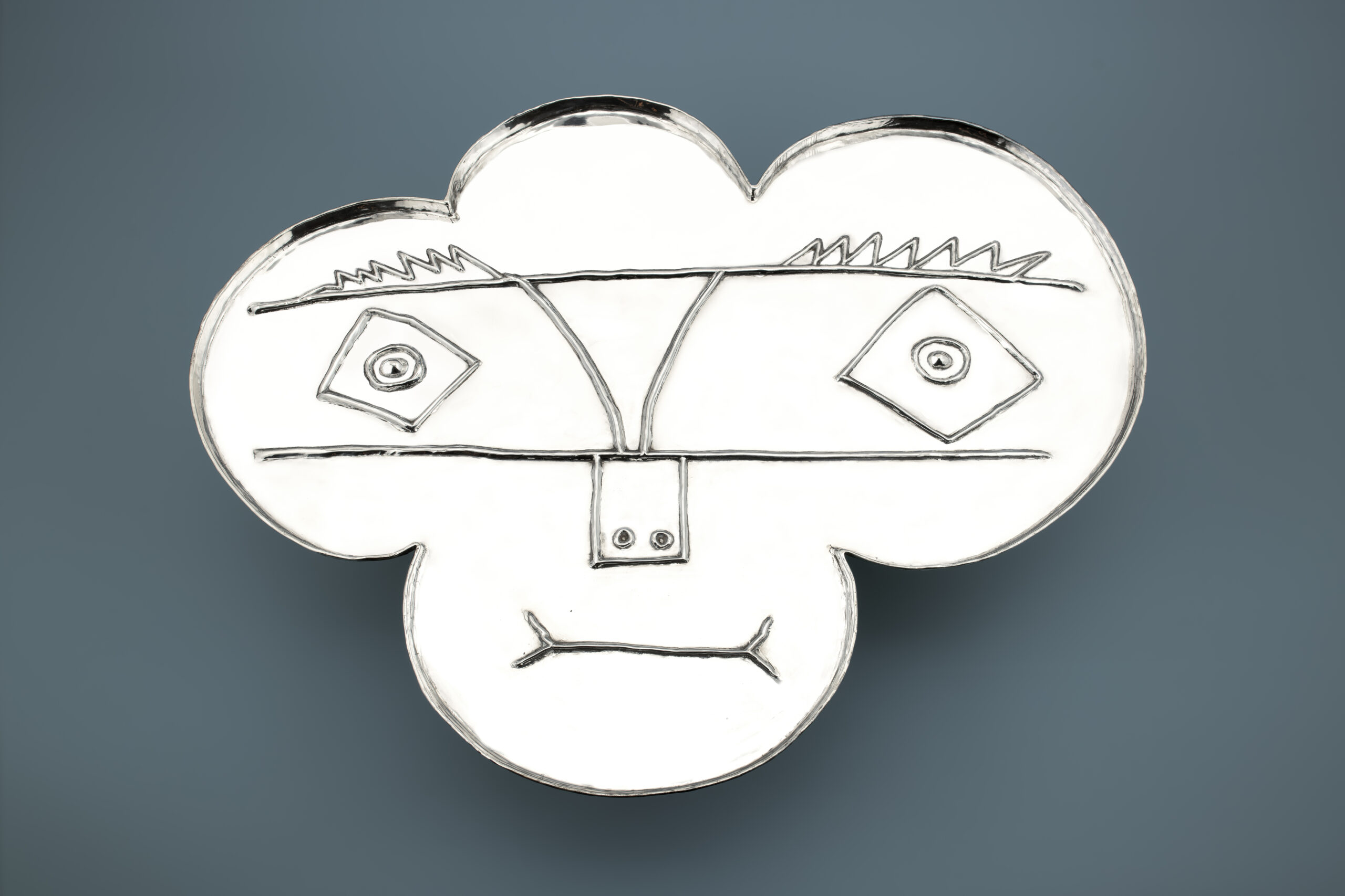 The pursuit of such experimental, unconventional procedures was of particular value to Picasso, who constantly sought to push artistic boundaries. The striking, clover-leaf-like face of the Compotier trèfle is characteristic of Picasso’s late portraits, in which a similarly radiating facial structure appears repeatedly. As the artist grew older, he became increasingly fascinated by the different stages of life, personality types and social classes of humankind. This theme of the comédie humaine is beautifully expressed in Picasso’s silver oeuvre. His silver plates and compotiers each depict faces with their own distinctive characteristics. Taken together, they form a colourful panorama of different human types within society. The Compotier trèfle, by recalling the features of Picasso’s late self-portraits, appears to engage with the theme of ageing. Once the silver has been polished to a high sheen, the viewer sees their own reflection, raising the question of how one relates to the character created by Picasso on one’s own place within the comédie humaine.