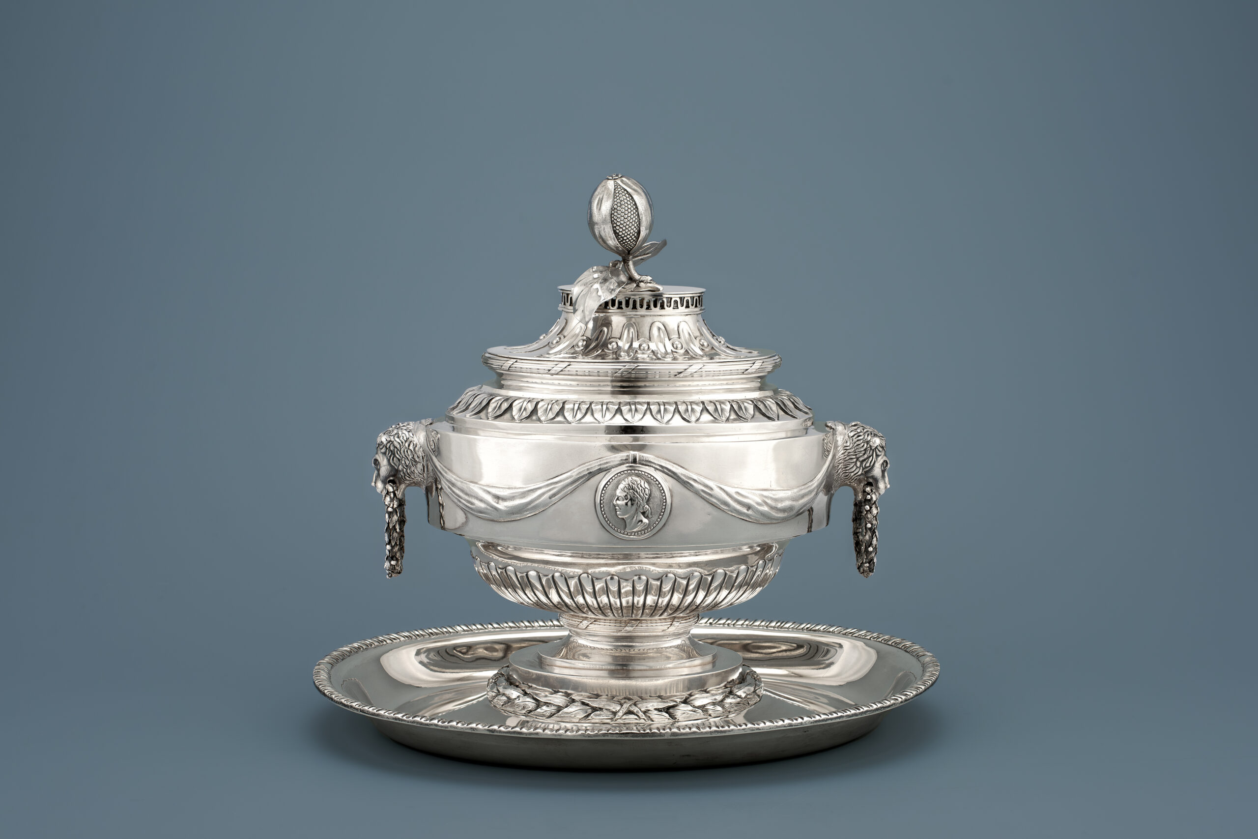 An oval-shaped silver tureen on stand in Louis XVI style. The lid of the tureen is crowned with…