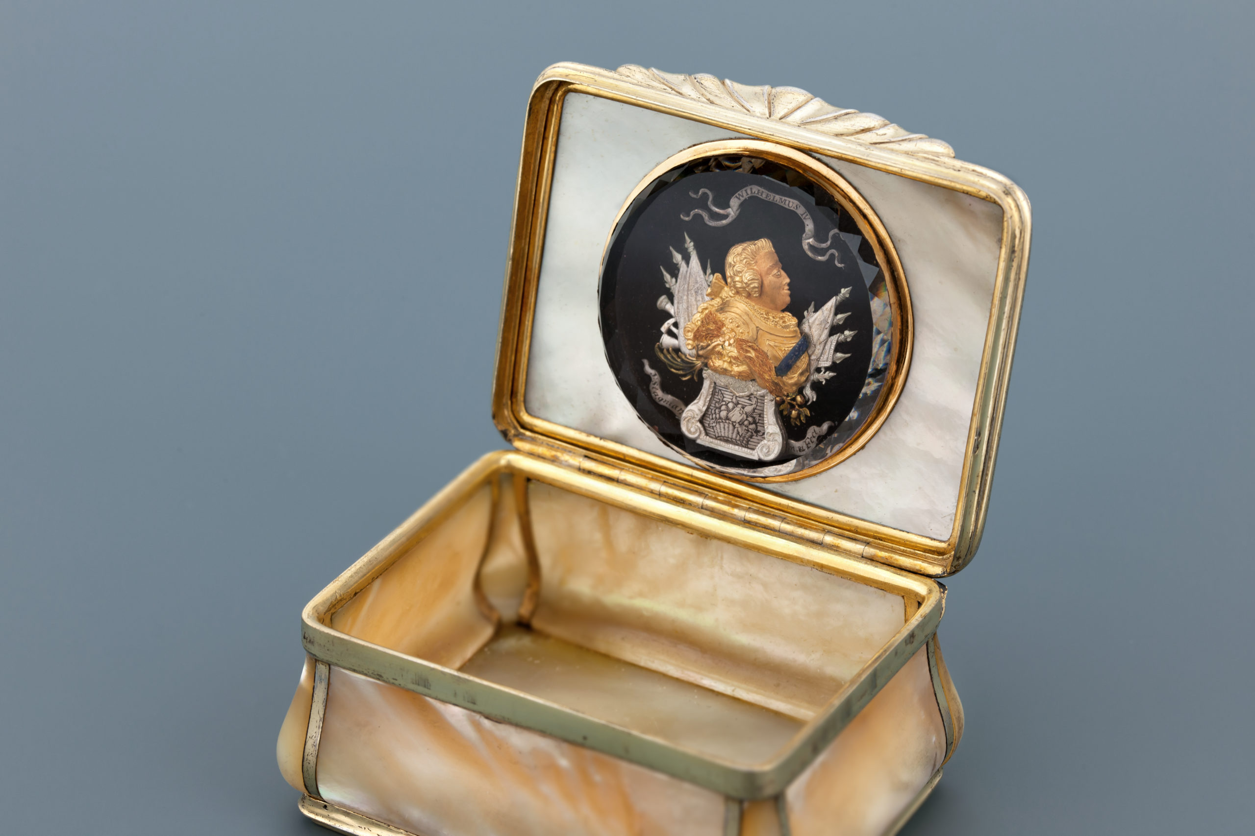 Both the box and the portrait medallion on the inside cover originally were a royal gift: the box was presented by the King of Poland, Stanislaus Leszczyński, who was the father-in-law of the French king Louis XV. The portrait on the inside lid was presented by the stadtholder, Prince William IV of the Netherlands. Both original objects were given around 1750 to a sole proprietor, who must have assembled the two into one snuff box.