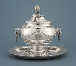 An oval-shaped silver tureen on stand in Louis XVI style. The lid of the tureen is crowned with a pomegranate, encircled by a meander border and egg-and-dart molding. The body of the tureen is decorated at the top with a band of long, pointed leaves. At the short ends appear lion or tiger heads holding laurel wreaths in their mouths, while on the long sides runs a draped garland with a central profile portrait medallion. Beneath this the body tapers down toward the foot, which is encircled by fluting. Around the base runs a laurel wreath. The accompanying stand has a smooth interior and ribbed outer edge. Engraved on the underside of the stand is the following text: