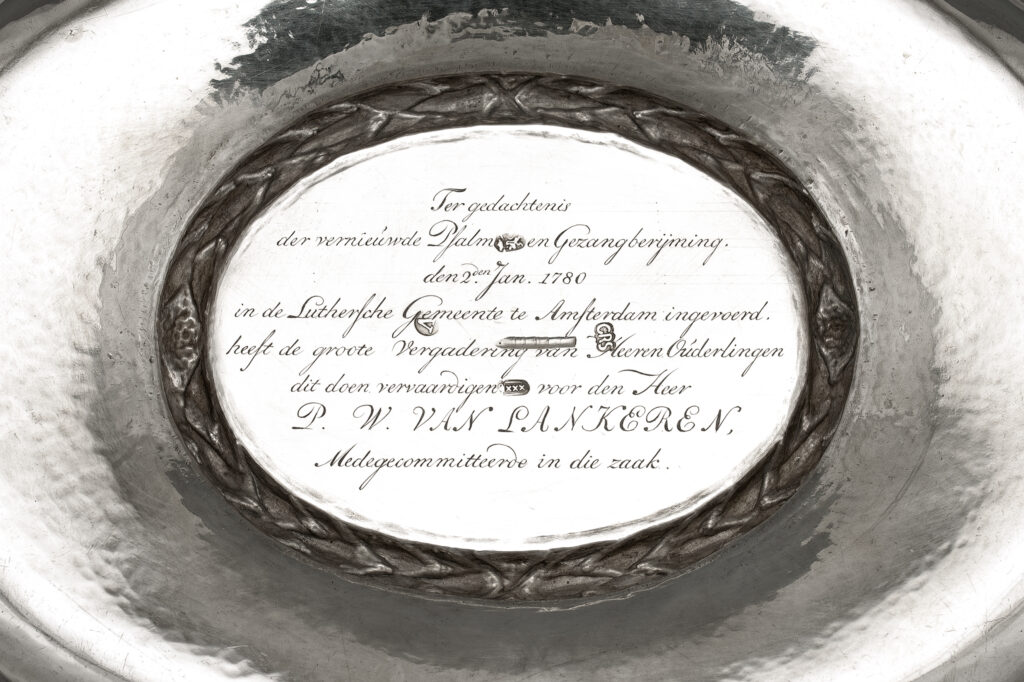 To create new versifications, the large consistory—the church’s main assembly—appointed in 1770 a small committee consisting of two experienced preachers and two so called ‘elders’. Elders were affluent men who served as cultural guardians within community life and took on supporting tasks. Initially, the deputies had great difficulty with the new versifications, and it was only after several years—when they enlisted the help of renowned poets such as Nicolaas Beets and Jan Jakob Lodewijk ten Kate—that the project gained momentum. Ultimately, the definitive version of the modernized hymnbook was approved by the large consistory in December 1778, more than eight years after the project began. Once enough books had been printed for the entire congregation, the new versifications were officially introduced and used in services from January 2, 1780. This special occasion was commemorated with the silver tureen and stand, as the inscription beneath the stand makes clear. As a token of gratitude for his dedication, the elders presented the set to their chairman, Pieter Willem van Lankeren, who from 1773 had been one of the four deputies. It is likely that the other three deputies received similar gifts.